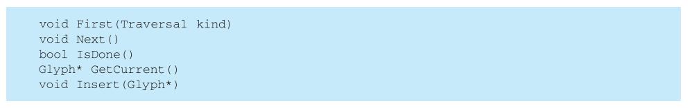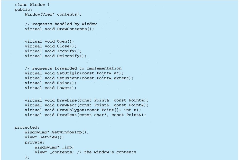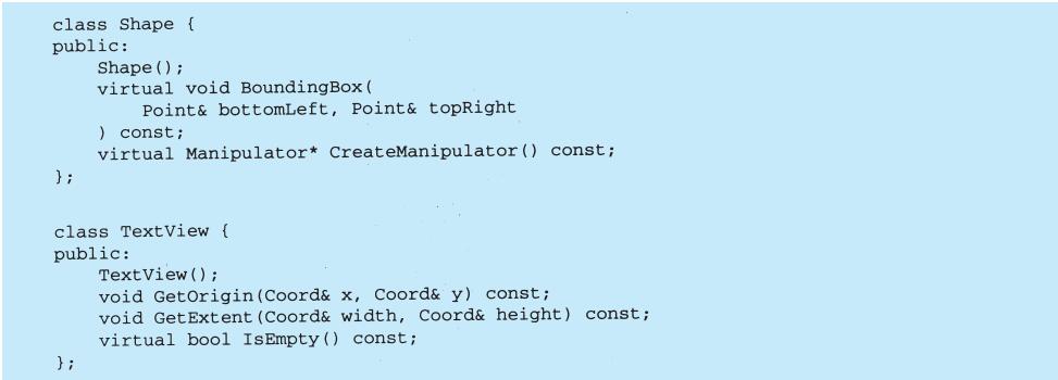 interface(接口)一个对象所有操作定义的型构的集合。接口刻画了一个对象可响应的请求的集合。