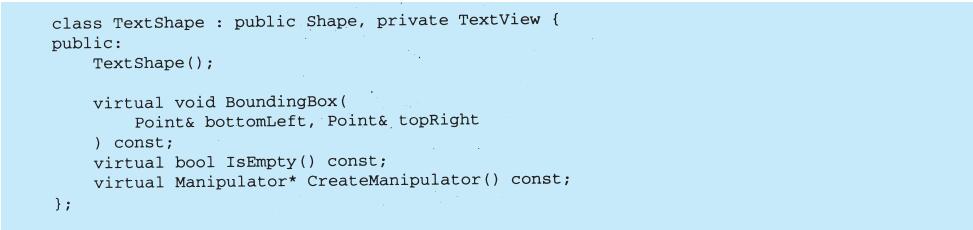 上例反映了可以将组合视图与其构件平等对待的设计,同样,该设计也适用于更一般的问题:将一些对象划为一组,并将该组对象当作一个对象来使用。这个设计被描述为Composite(4.3)模式,该模式允许你创建一个类层次结构,一些子类定义了原子对象(如Button)而其他类定义了组合对象(CompositeView),这些组合对象是由原子对象组合而成的更复杂的对象。