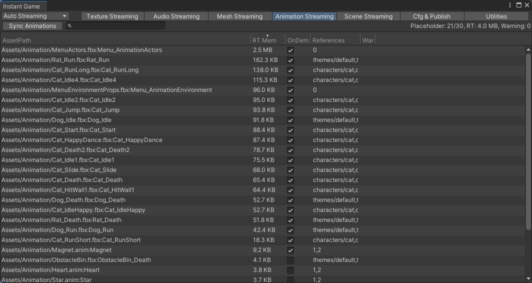 AutoStreaming 保留了这几类资源的对象,支持将本地较大的音频和mesh等资源内的数据从 游戏首包 / AB 中抽离出来,部署到 UOS CDN 服务器上。当游戏首次使用到该 Audio / Mesh / Animation 资源时,将触发引擎后台线程下载资源数据,完成后自动加载使用。