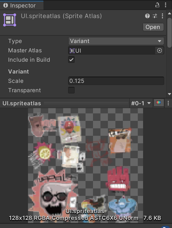 图集的 Streaming 配置与纹理资源类似,也在 Texture Streaming 页面设置,但我们使用图集的 Variant 作为 Placeholder,通过调整 Variant 的 Scale 来缩小尺寸。 在 Variant 图集的 Inspector 窗口勾选 Transparent 选项,可以使用透明贴图。