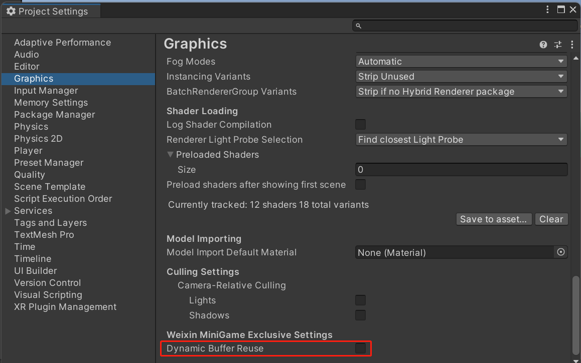设置选项位于 Project Settings -> Graphics,Dynamic Buffer Reuse 默认开启。