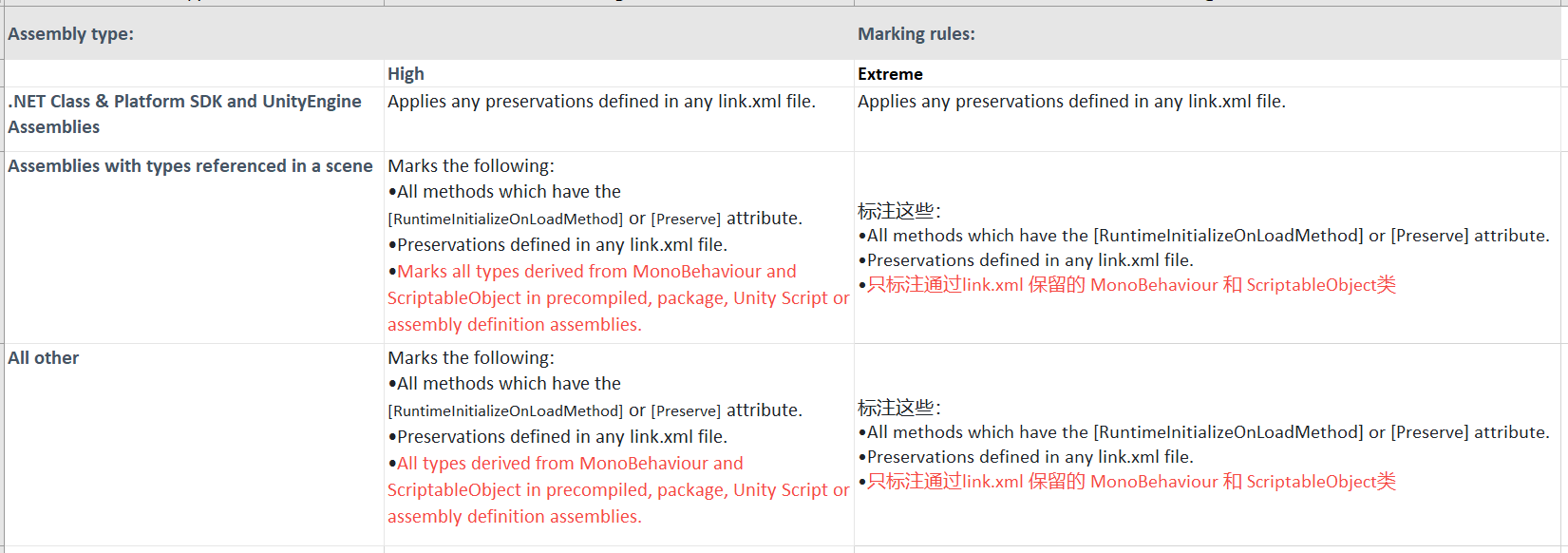 Managed Code 剔除会对代码进行静态分析。首先依据 root marking rules 标记root类型、方法、属性等,然后再依据 dependency marking rules 去标记这些root的依赖。接下来未被标记的代码会被剔除。新增的 Extreme Level,使用了更加激进的标记规则,与 High Level 对比如下: