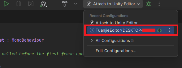打开 Tuanjie 的项目,将代码编辑器更改为 Rider,后双击对应的脚本文件,打开 Rider。之后点击下图所示的选项,就可以连接上去了