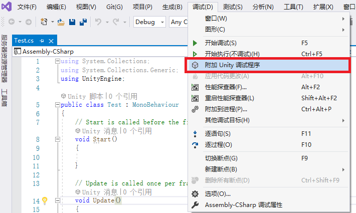 打开 Tuanjie 的项目,将代码编辑器更改为 Visual Studio,后双击对应的脚本文件,打开 Visual Studio。之后点击下图所示的选项