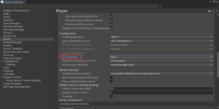 通过 Build Settings -> Player Settings(或者选择菜单栏:Edit -> Project Settings),在 Player -> Other Settings -> Configuration 栏目中找到 GC algorithm 选项,在下拉菜单中选择 SGen 或者 Boehm。