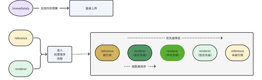 TextureManager 支持设置纹理显存用量上限。当显存用量达到预设时,会根据策略计算纹理的分值并排序,优先从 GPU 上踢出低分值纹理。计算分值时会考虑:
