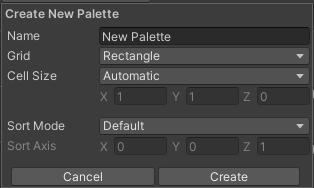 命名新创建的面板并选择所需的设置,然后选择 Create 按钮。出现提示时,选择要将 Palette Asset 文件保存到的文件夹。新创建的面板会自动加载到 Tile Palette 窗口中。