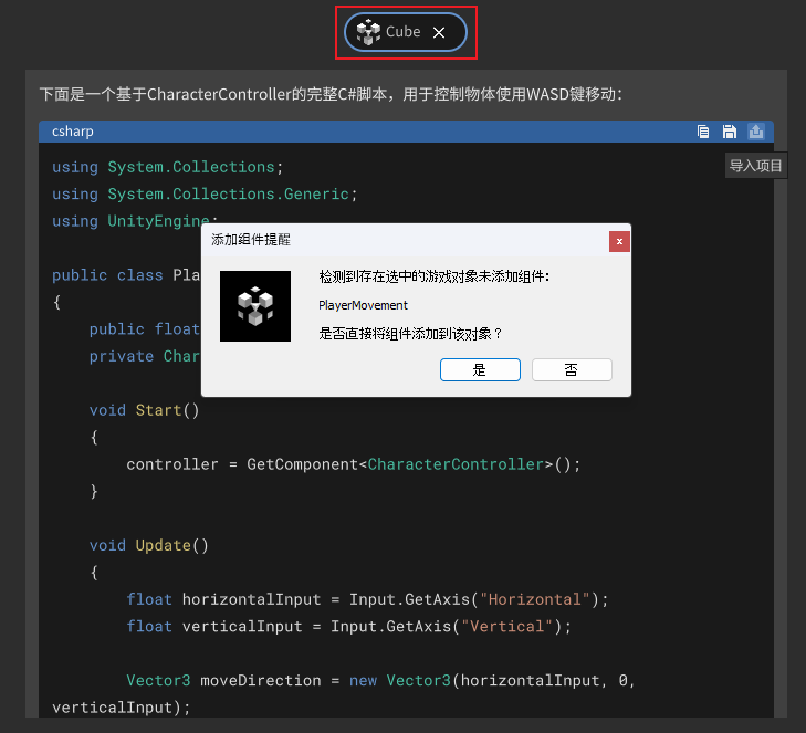 如果导入C#脚本或者Shader时选中了相应的GameObject或Asset,支持自动挂载到组件或者材质: