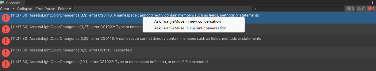 为了便于开发者快速调试报错,现可以在Console面板中右键报错信息直接询问团结Muse: