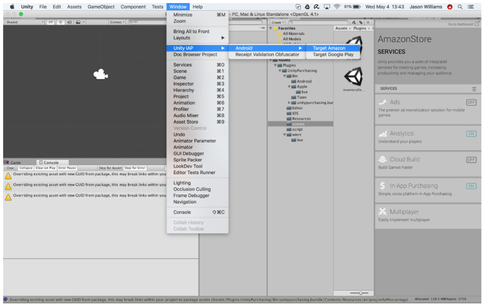设置 IAP 目标商店。您应该已经设置好一个 Android 应用程序。请使用 Unity IAP Window > Unity IAP > Android > Target Amazon 菜单项来设置目标商店。此菜单项用于在 Google、Amazon 和其他 Android 应用商店之间切换。
