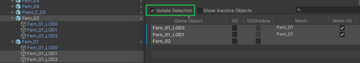 使用VG Mesh的MeshRenderer的VG选项会与LODGroup保持一致并不可单独编辑,未使用VG Mesh或Inactive的Mesh Renderer则需要用户单独进行修改,详见如何使用-在LODGroup上启用虚拟几何体