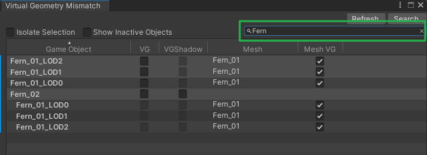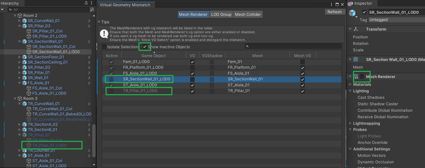 在Virtual Geometry Mismatch 窗口中可以批量查找和处理Mesh Renderer和模型的Virtual Geometry不匹配的情况。