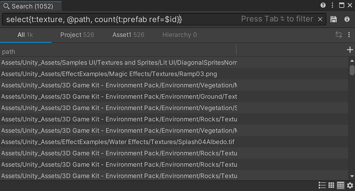 t:texture)@path of the texture (@path)count{t:prefab ref=@id}). In the example, @id refers to the SearchItem.id of each texture item.