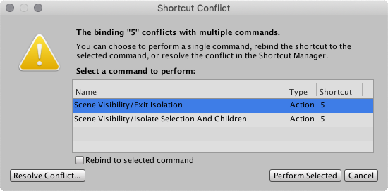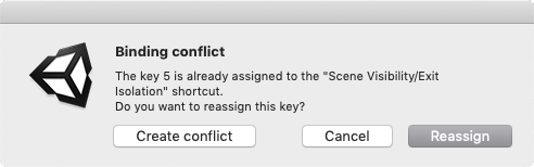 在 Unity 中操作时,使用分配给冲突命令的快捷键将打开 Shortcut Conflict 对话框。