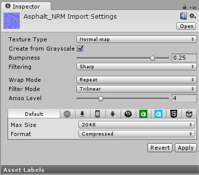选中“Create From Greyscale”后,检视面板中将显示 Bumpiness 滑动条。从高度贴图中的高度进行转换时,可使用此滑动条来控制法线贴图中的角度剧烈程度。较低的凹凸值意味着,即使高度贴图中的鲜明对比度也会转换为平缓的角度和凹凸。较高的值会产生夸张的凹凸和对凹凸的高对比度光照响应。