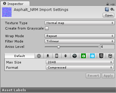 像往常一样,可通过将纹理文件放入 Assets 文件夹的方式导入法线贴图。但是,需要告诉 Unity,此纹理为法线贴图。为此,可在导入检视面板 (Inspector) 设置中将“Texture Type”设置更改为“Normal Map”。