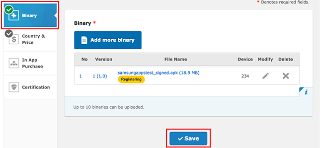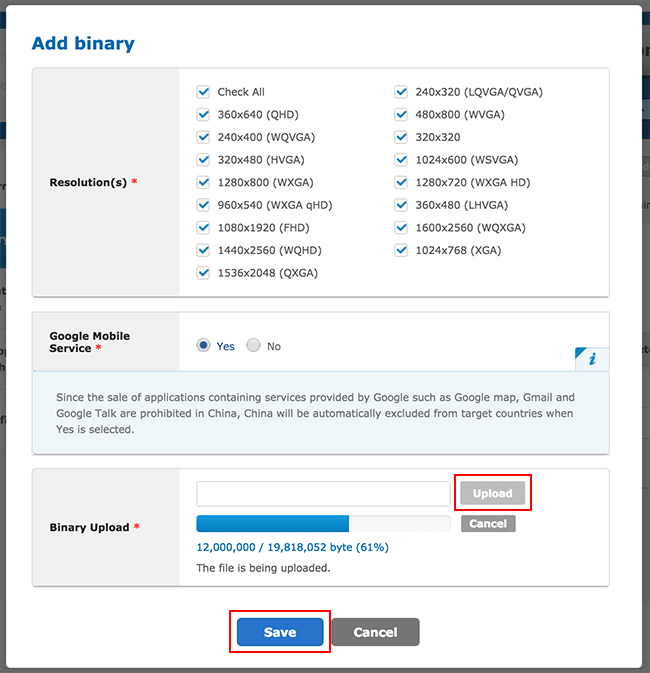 在 Resolution(s) 和 Google Mobile Service 中填写设备特征,在 Binary upload 内上传您的 APK(在上文的“准备开始”部分中创建的 APK),然后单击 Save。