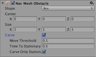 | Move Threshold | 当导航网格障碍物的移动距离超过 Move Threshold 设置的值时,Unity 会将其视为移动状态。使用此属性可设置该阈值距离来更新移动的雕孔。 |