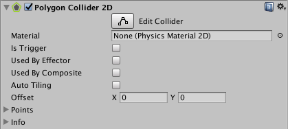 The Polygon Collider 2D component is a Collider that interacts with the 2D physics system. The Collider’s shape is defined by a freeform edge made of line segments, that you can adjust to fit the shape of the Sprite or any other shape. Note that this Collider’s edge must completely enclose an area to function.