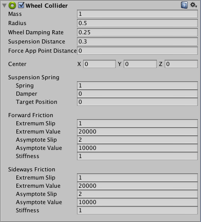 车轮碰撞体 (Wheel Collider) 是一种用于地面交通工具的特殊碰撞体。此碰撞体内置了碰撞检测、车轮物理组件和基于打滑的轮胎摩擦模型。此碰撞体可以用于除车轮以外的其他对象,但专门设计用于有轮的交通工具。