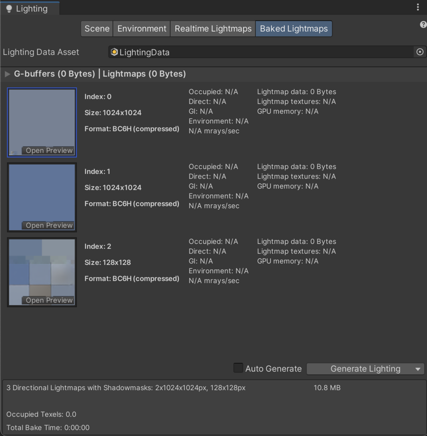 此选项卡显示光照贴图为当前场景生成的所有光照贴图的列表,以及光照数据资源。如果项目中未启用烘焙全局光照 (Baked Global Illumination),则此选项卡将为空。