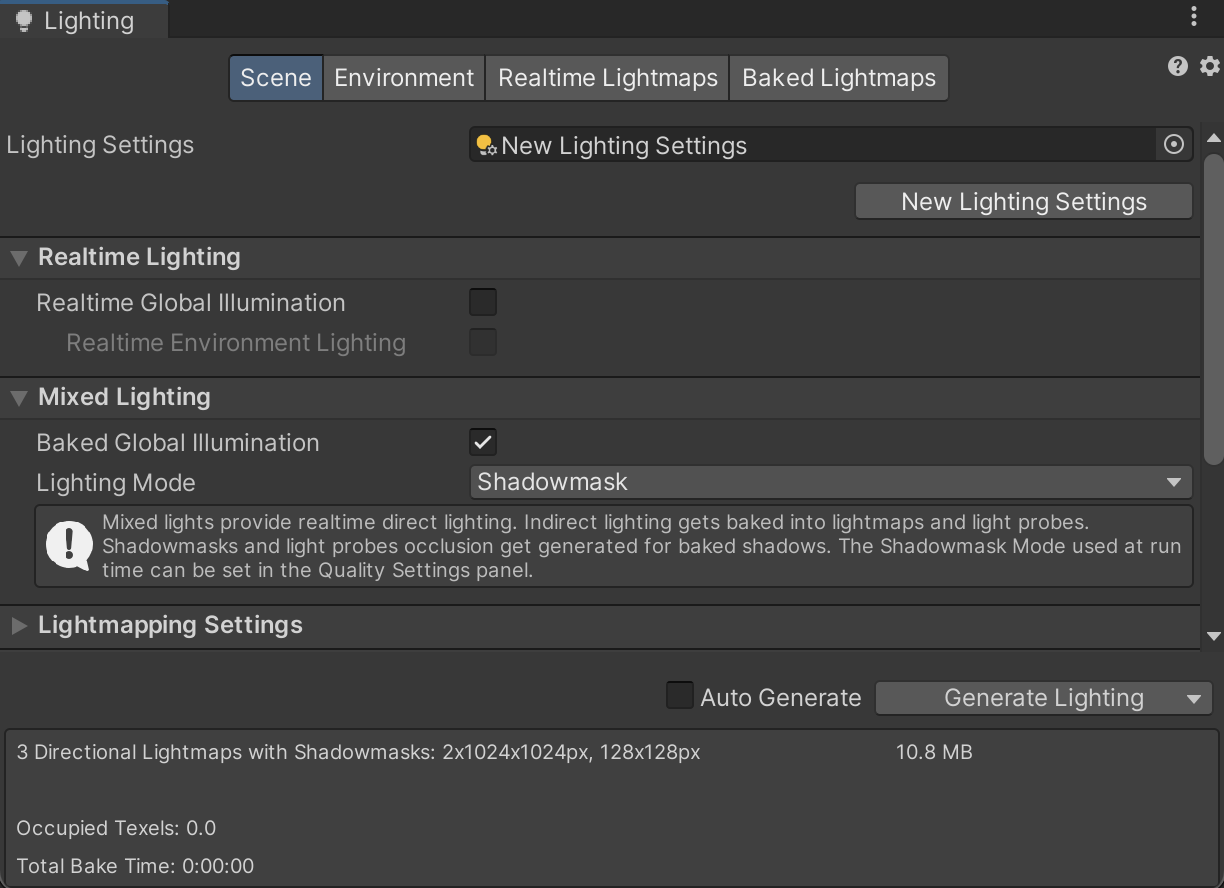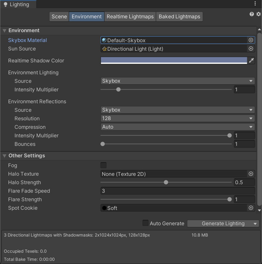 Use this section to view and edit the properties of the Lighting Settings Asset or LightingSettings object assigned to the current Scene. See Lighting Settings Asset.
