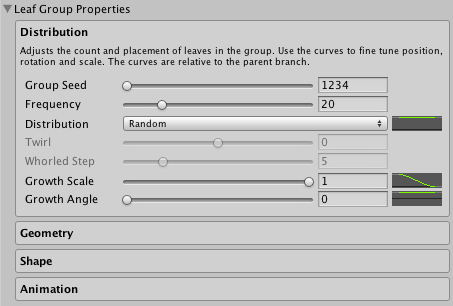 调整树叶组中的树叶数量和位置。使用曲线可微调位置、旋转和缩放。这些曲线相对于父级树枝。