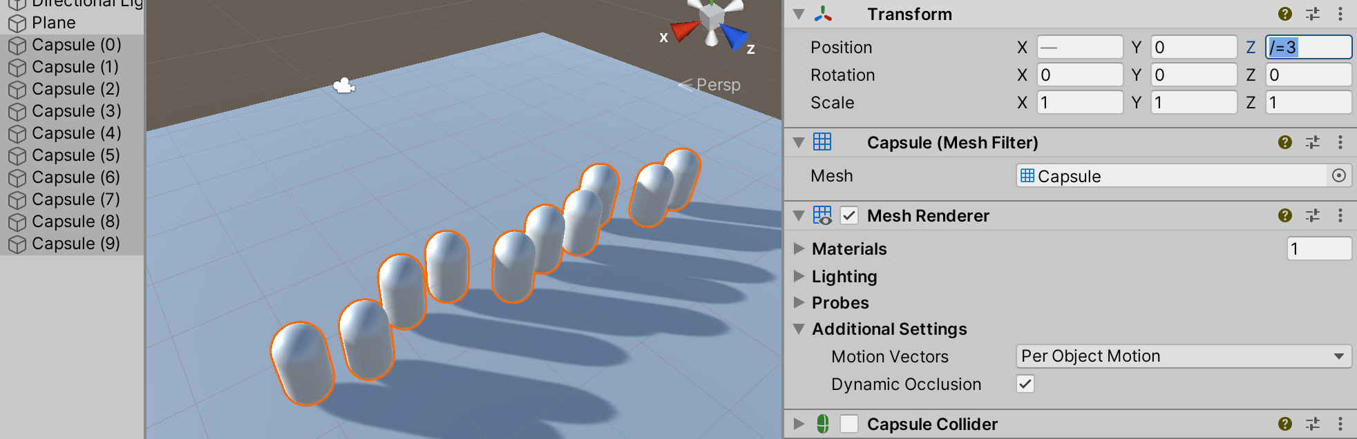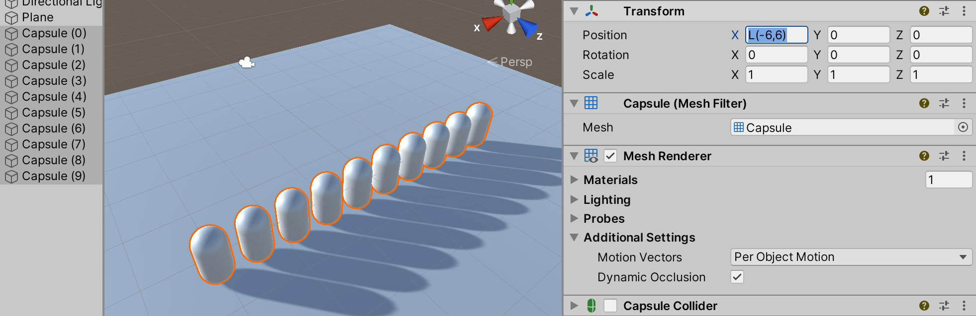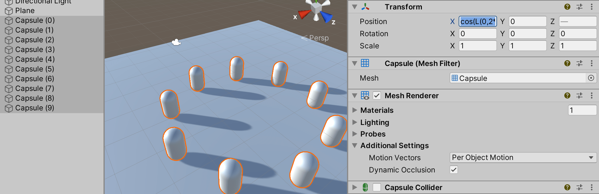 Entering cos(L(0,2*pi))*5 into X and sin(L(0,2*pi))*5 into Z coordinates places the ten selected capsules in a circle.