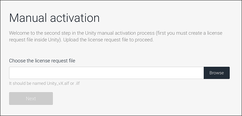 .ulf) 文件生成许可证激活 (.alf) 文件后,下一步是从许可证服务器请求您的 Unity 许可证 (.ulf) 文件: