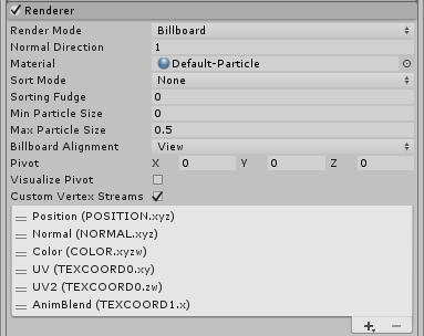 使用 Tangent 流来支持法线贴图粒子。 可以删除 Color,然后添加 Tangent UV2AnimBlend 流以便在粒子上使用标准着色器。 * 需要轻松执行翻页动画的线性纹理混合,请添加 UV2 和 AnimBlend 流,并附加粒子/动画 Alpha 混合着色器 (Particles/Anim Alpha Blended Shader)(请参阅下面的示例截屏,了解如何对其进行设置)。