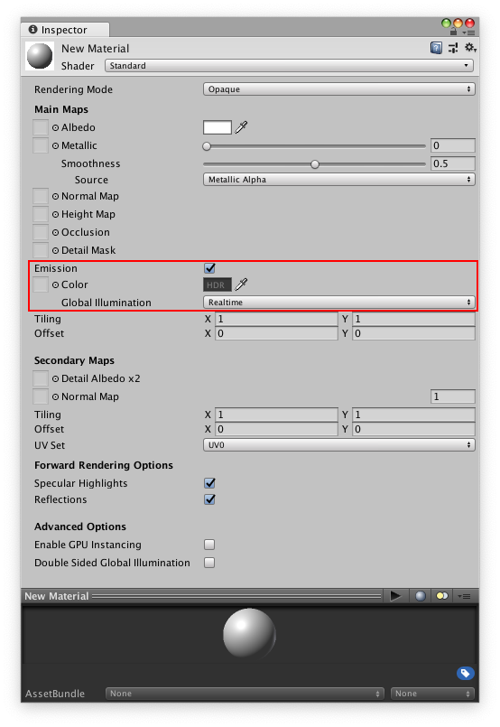 Global Illumination 指定此材质发出的光如何影响附近其他游戏对象的环境光照。有三个选项: