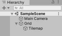 选择 Tilemap 选项后,在场景中将会创建一个新的 Grid 游戏对象,其中包含 Tilemap 子游戏对象。Grid 游戏对象决定了其子 Tilemap 的布局。