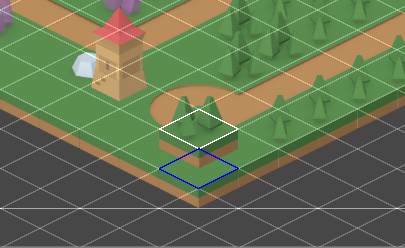 在 Scene 视图中,画笔预览会将单元格原始位置(Z 值为 0)的瓦片显示为蓝色轮廓,而其应用了 Z-as-Y 偏移的绘制位置则显示为白色轮廓。