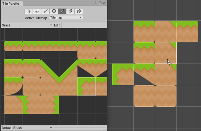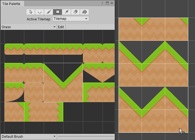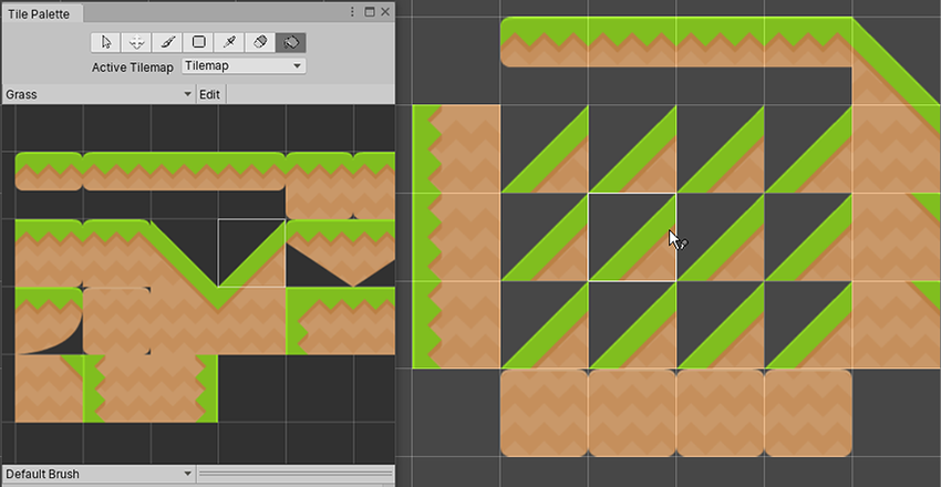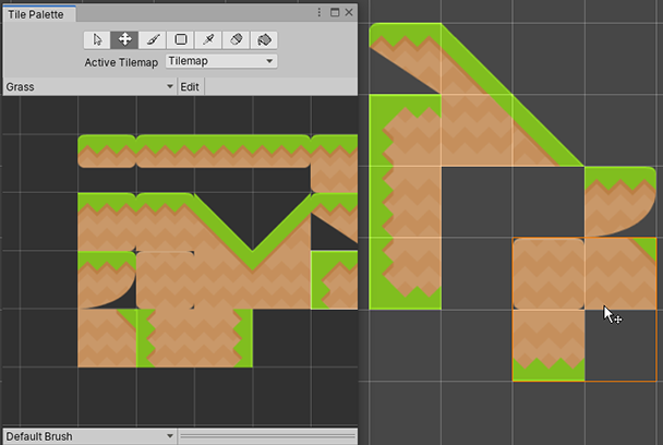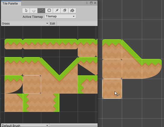 使用画笔工具选择瓦片地图面板 (Tilemap Palette) 中的瓦片,或按住并在多个瓦片上拖动来一次选择多个瓦片。然后单击场景中瓦片地图上的任何位置即可开始使用所选的瓦片进行绘制。使用画笔工具时按住 Shift 可切换到擦除工具