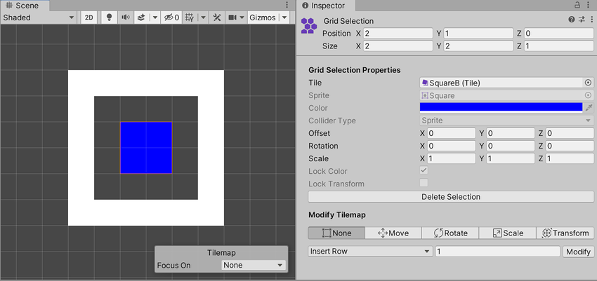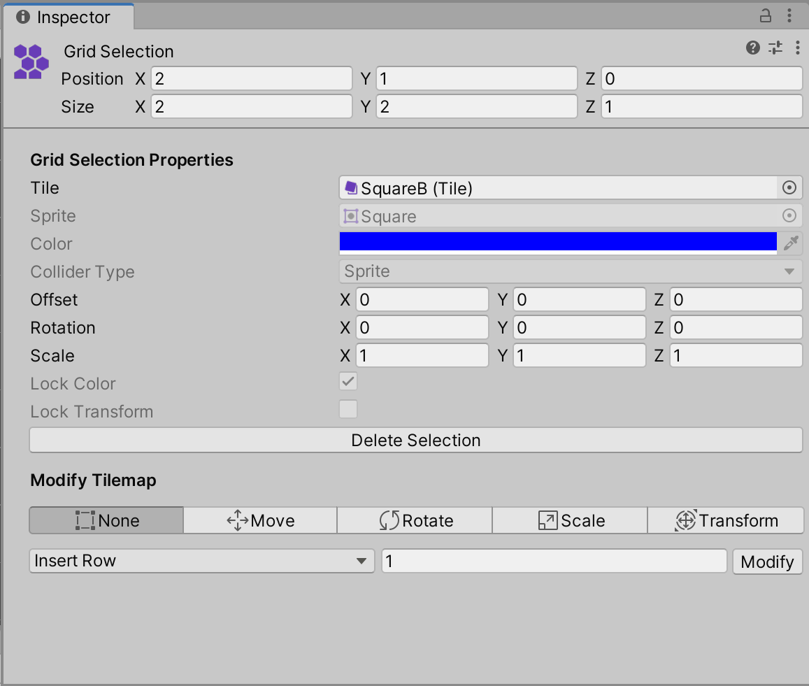 选择工具 Inspector 窗口包含以下两个主要部分,即 Grid SelectionModify Tilemap 属性设置。