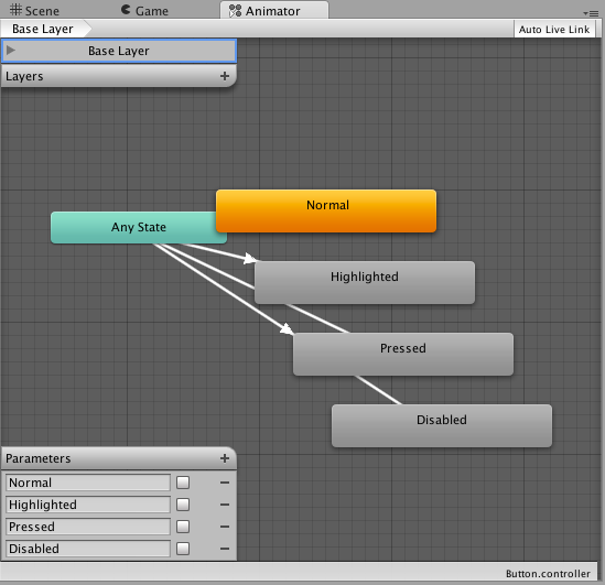 通过动画可以使用 Unity 的动画系统完全动画化控件状态之间的每个过渡。由于可以同时动画化的属性数量很多,因此这是最强大的过渡模式。