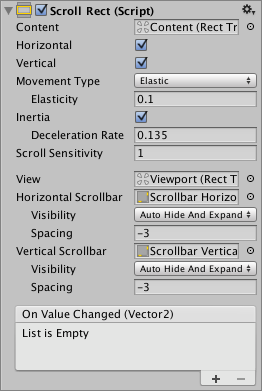 On Value Changed 滚动矩形的滚动位置发生变化时调用的 UnityEvent。该事件可将当前滚动位置作为 Vector2 类型动态参数发送。