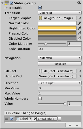 On Value Changed 滑动条的当前值已变化时调用的 UnityEvent。该事件可将当前值作为 float 类型动态参数发送。无论是否已启用 Whole Numbers 属性,该值都将作为 float 类型传递。