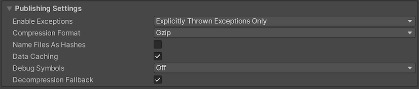 • __Full With Stacktrace__:此选项与上面的选项类似,但也捕获堆栈跟踪。Unity 通过在代码中嵌入对异常检查来生成这些异常,因此该选项会降低性能并增加浏览器内存使用量。仅用于调试,并始终在 64 位浏览器中进行测试。