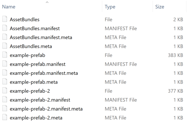 如果您遵循 AssetBundle 工作流程并使用示例类 CreateAssetBundles 来构建 AssetBundle,每个生成的 AssetBundle 都会包含此材质(包括其着色器和引用的纹理)。在以下示例图像中,预制件文件的大小分别为 383 KB 和 377 KB。