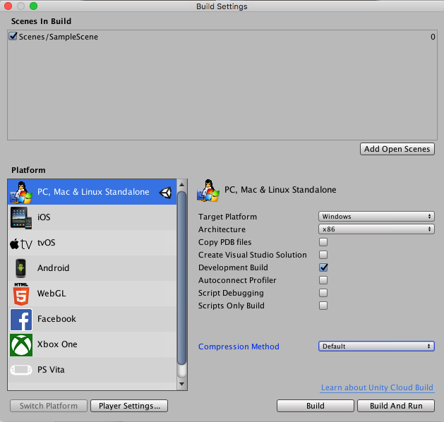 Go to File > Build Settings, and under Platform, select Windows, Mac, Linux. Set the Target Platform to Windows, set the Architecture to Intel 64-bit, and click the Development Build checkbox.