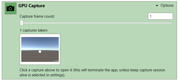 8.照常使用应用程序,直到准备好捕获帧。要捕获帧,请按键盘上的 Print Screen 键,或单击 GPU Capture 面板上的摄像机图标。在面板中将显示捕获的缩略图。要打开捕获结果,请单击缩略图。
