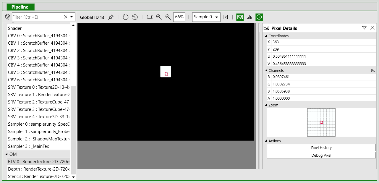 11.在 Pipeline 选项卡的下半部分,从 OM (Output Merger) 列表中选择一个渲染目标以查看绘制调用的输出。在要调试的对象上选择一个像素。请注意,为了查找感兴趣的绘制调用,一种方法是可以右键单击像素以查看绘制调用历史记录。