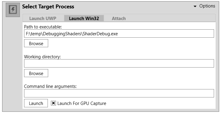 7.启用 Launch for GPU Capture__,然后使用 Launch__ 按钮启动应用程序。