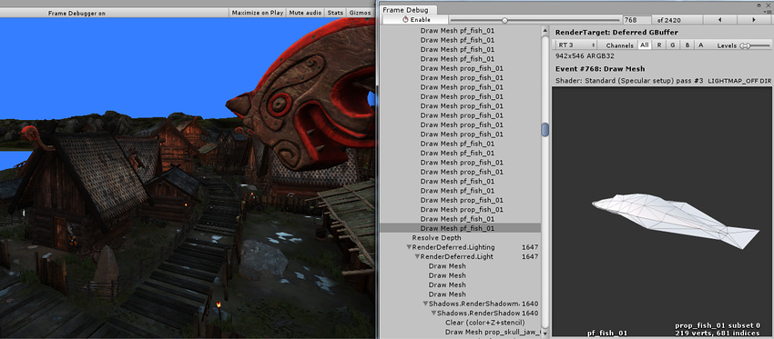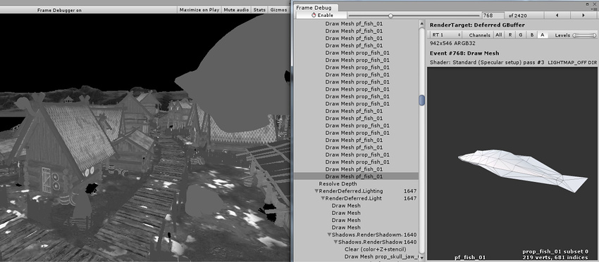 Frame Debugger 窗口(菜单:__Window__ > Analysis > __Frame Debugger__)会显示绘制调用信息,并允许您控制正在构建的帧的“回放”。