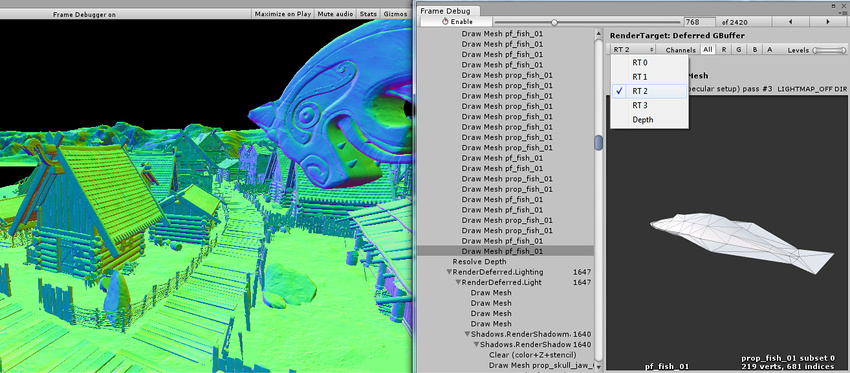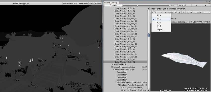如果在选定的绘制调用中,RenderTexture 发生渲染,那么该 RenderTexture 的内容将显示在 Game 视图中。这可用于检查各种屏幕外渲染目标是如何构建的,例如延迟着色中的漫射 G 缓冲区: