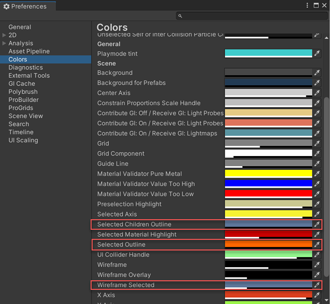 启用 Selection Outline 后,所选游戏对象及其子游戏对象周围将显示轮廓。默认情况下,Unity 以橙色显示所选游戏对象的轮廓,而以蓝色显示子游戏对象的轮廓。可以在 Unity 偏好设置中更改这些颜色(请参阅下文的选择颜色)。