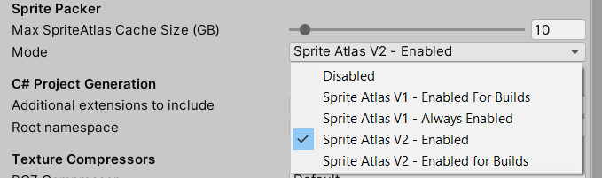 To enable Sprite Atlas V2 Sprite Packer mode, go to Edit > Project Settings > Sprite Packer > Mode, and select Sprite Atlas V2 - Enabled from the dropdown menu.