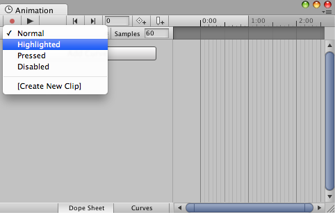 有一个 Animation Clip 弹出菜单可以选择所需的剪辑。选项包括“Normal”、“Highlighted”、“Pressed”和“Disabled”。