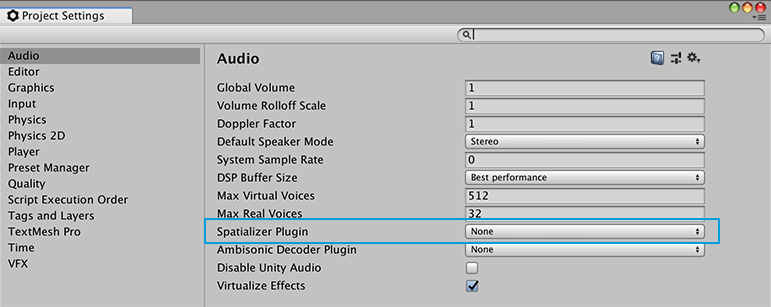 通过 Audio 设置(菜单:__Edit > Project Settings__,然后选择 Audio 类别)使用 Spatializer Plugin 下拉菜单可启用这些插件。原生插件可以在启用或不启用 VR 模式的情况下使用。